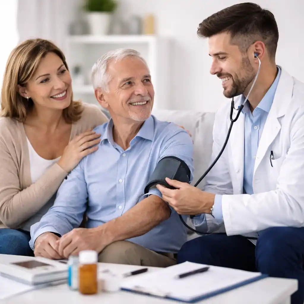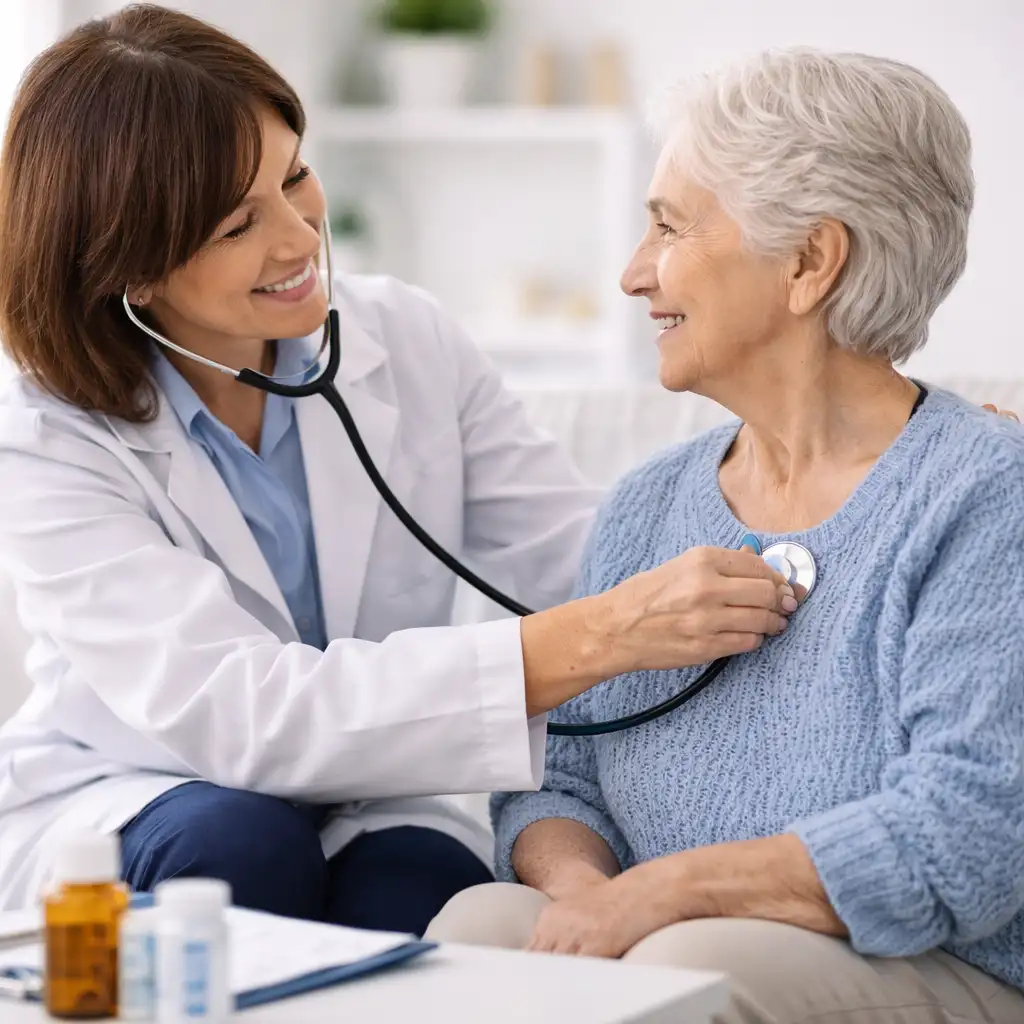 Atención médica especializada para adultos mayores, con seguimiento de enfermedades crónicas y control de salud desde el hogar.